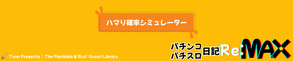 ハマり確率シミュレーター Probability calculator オッス!おらとぅーん!! 頑張って作った“ハマる確率シミュレーター”がついに完成したぞ! フリーザでもセルでも、この道具を使えば どんだけハマる可能性があるか一発でバレちまうくらいスゲェんだ! 修行の成果を見せる時がきたな! さぁ、ビビらずに回してみっぞ! とぅーん作!!ハマる確率シミュレーター 大当たり確率(1/n の nをご入力ください) 回転数(まわす予定回数orまわした回数) 計算する ※大当たり確率は 2〜999 の範囲で入力してください ※回転数は 1〜9999 の範囲で入力してください オッス!おらとぅーん!! ここに結果が表示されっぞ! ※本シミュレーターは理論値に基づいて計算しています。 ※実際のホール状況(釘・ストローク・電サポ・個体差など)は反映されません。 ※計算結果はあくまで「確率上の目安」であり、実際の結果を保証するものではありません。 ※入力値が極端な場合、計算結果が表示されないことがあります。 ※表示される「日に1度発生」は期待値であり、実際の発生頻度とは異なる場合があります。 ⭐投げ銭はこちら⭐ Click here for tips